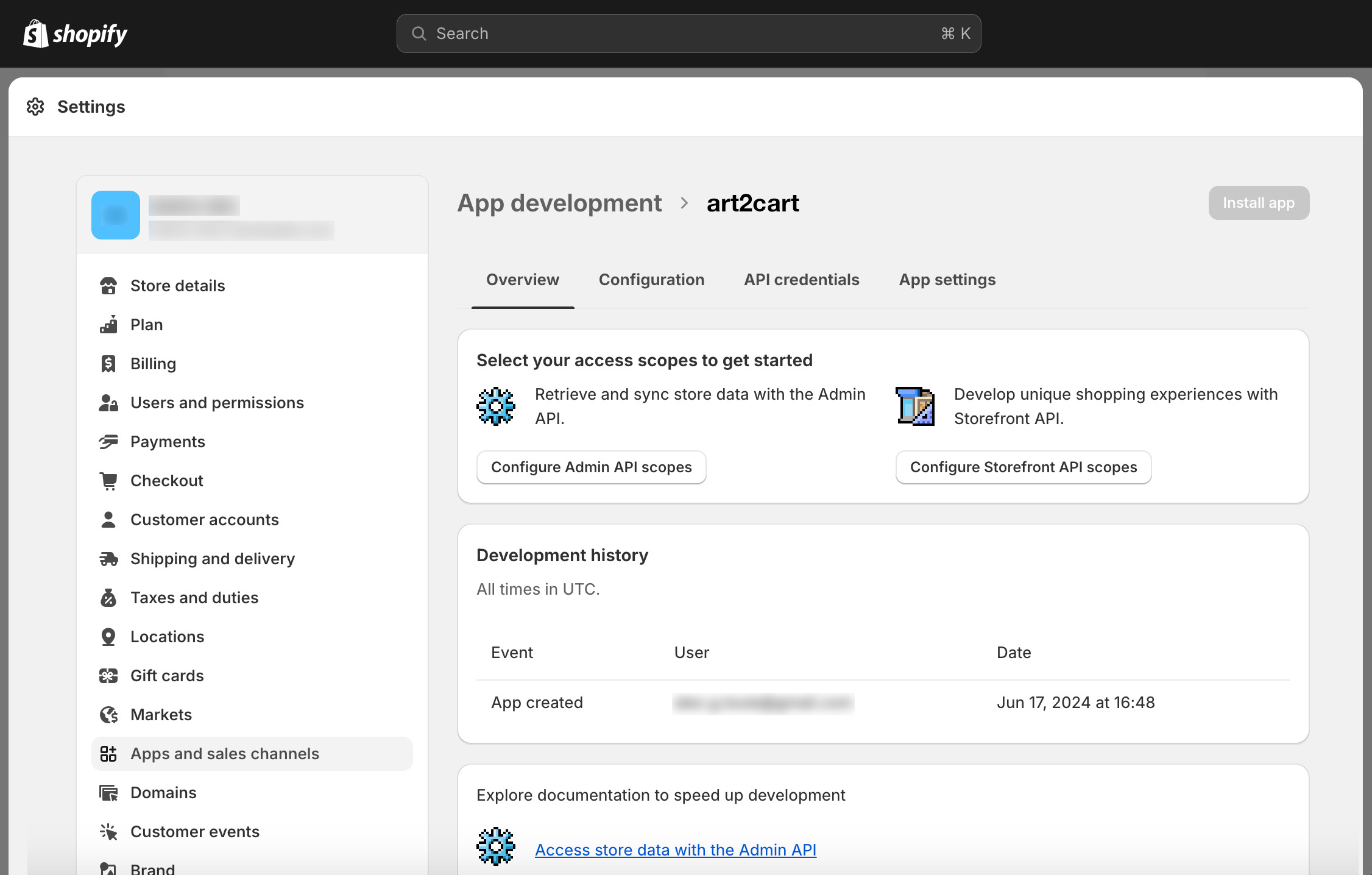 - On the App Dashboard, click the Overview tab and then click Configure Admin API Scopes.