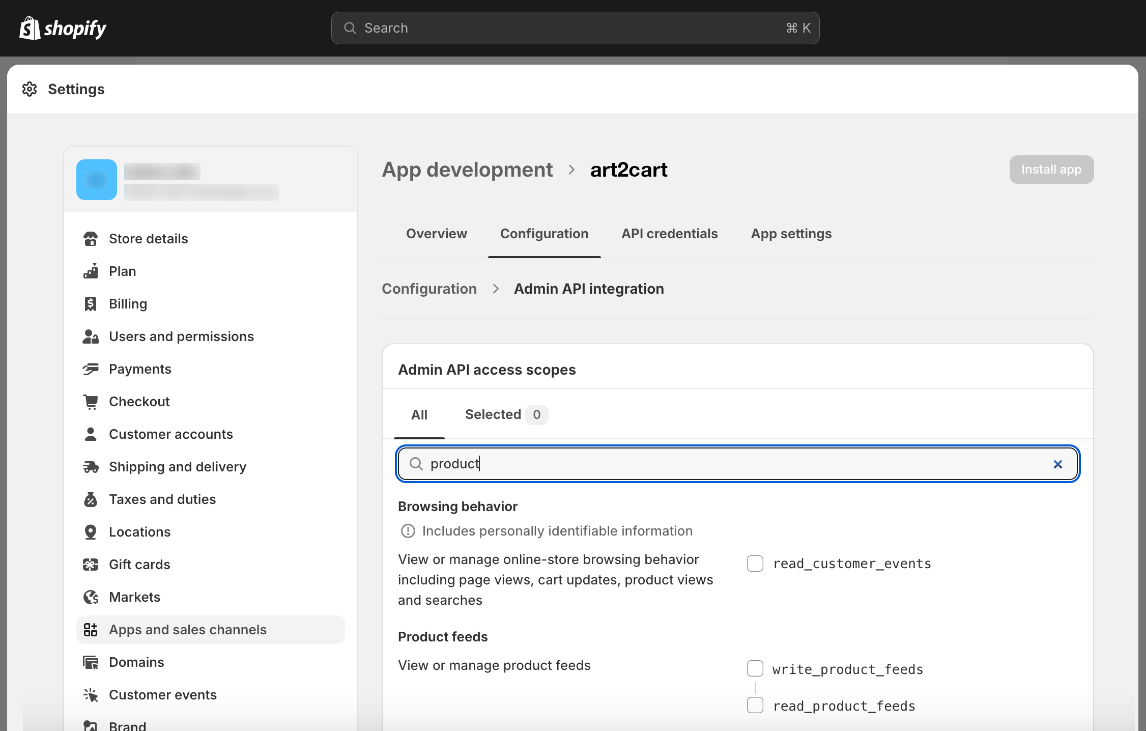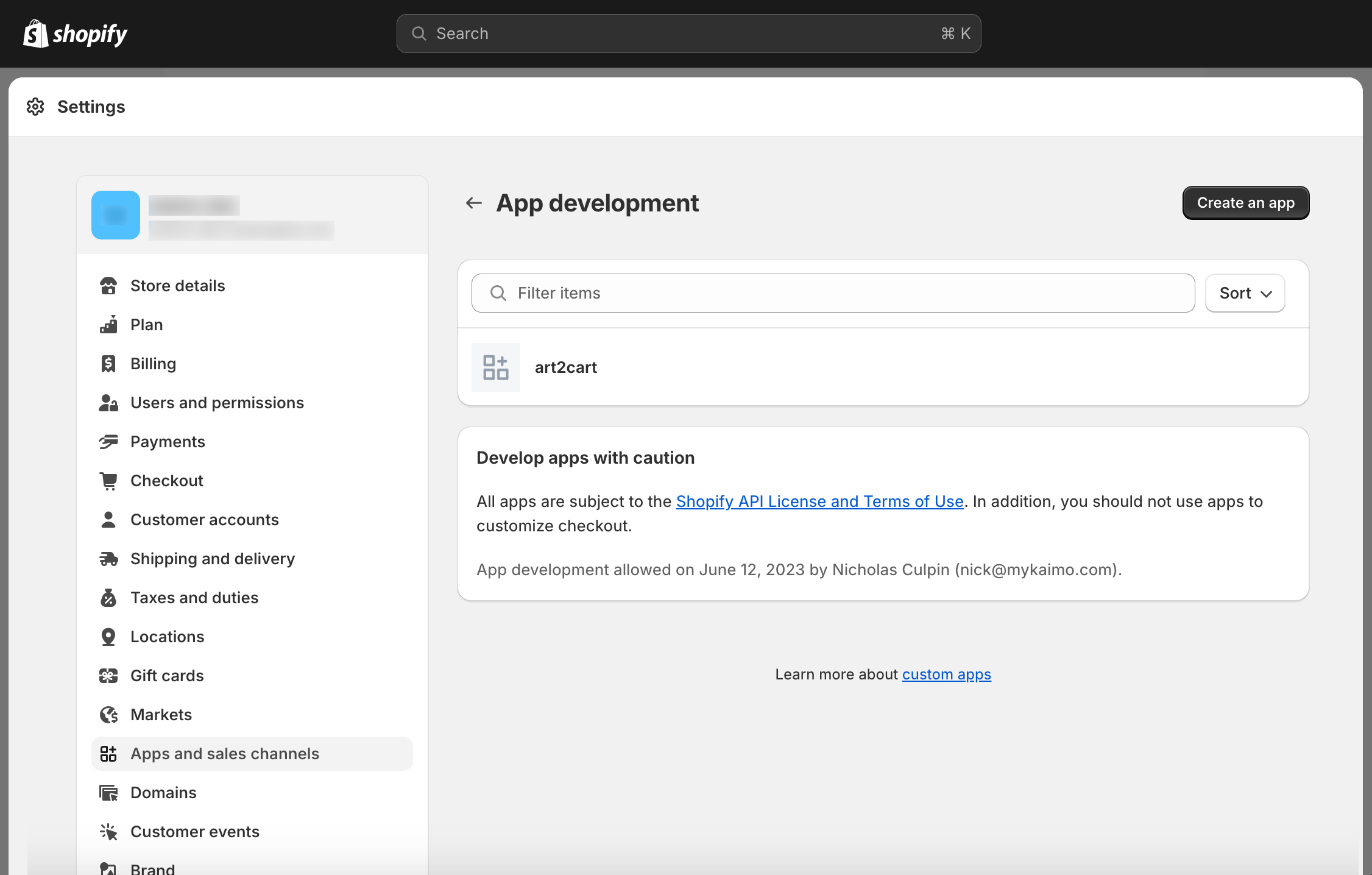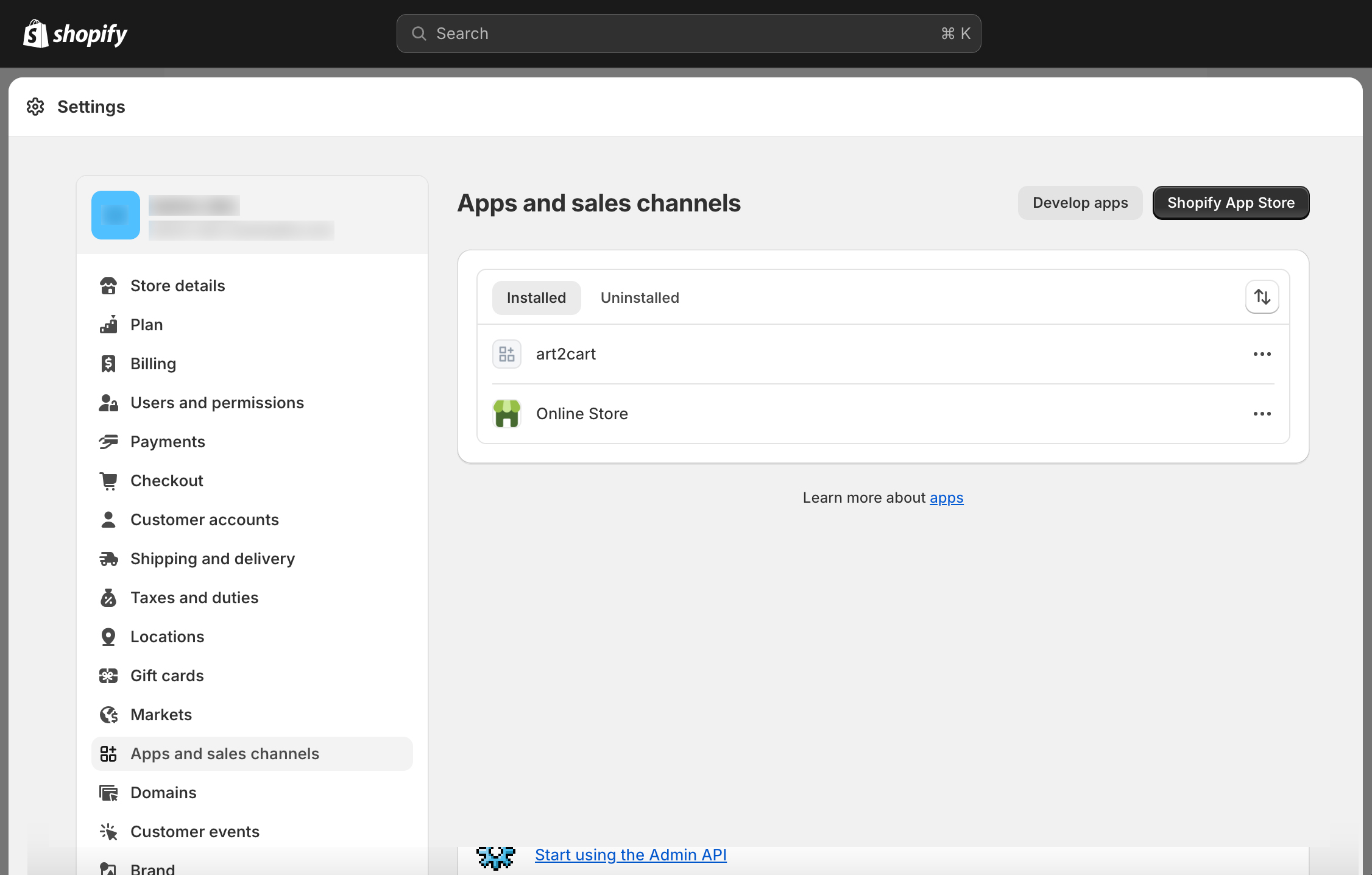 - If you wish to remove Art2Cart permissions from Shopify, return to the App and sales setting page. Find the Art2Cart installed app (or whatever you named it in step 4), click on the [...] button, and select Uninstall from the pop-up menu.