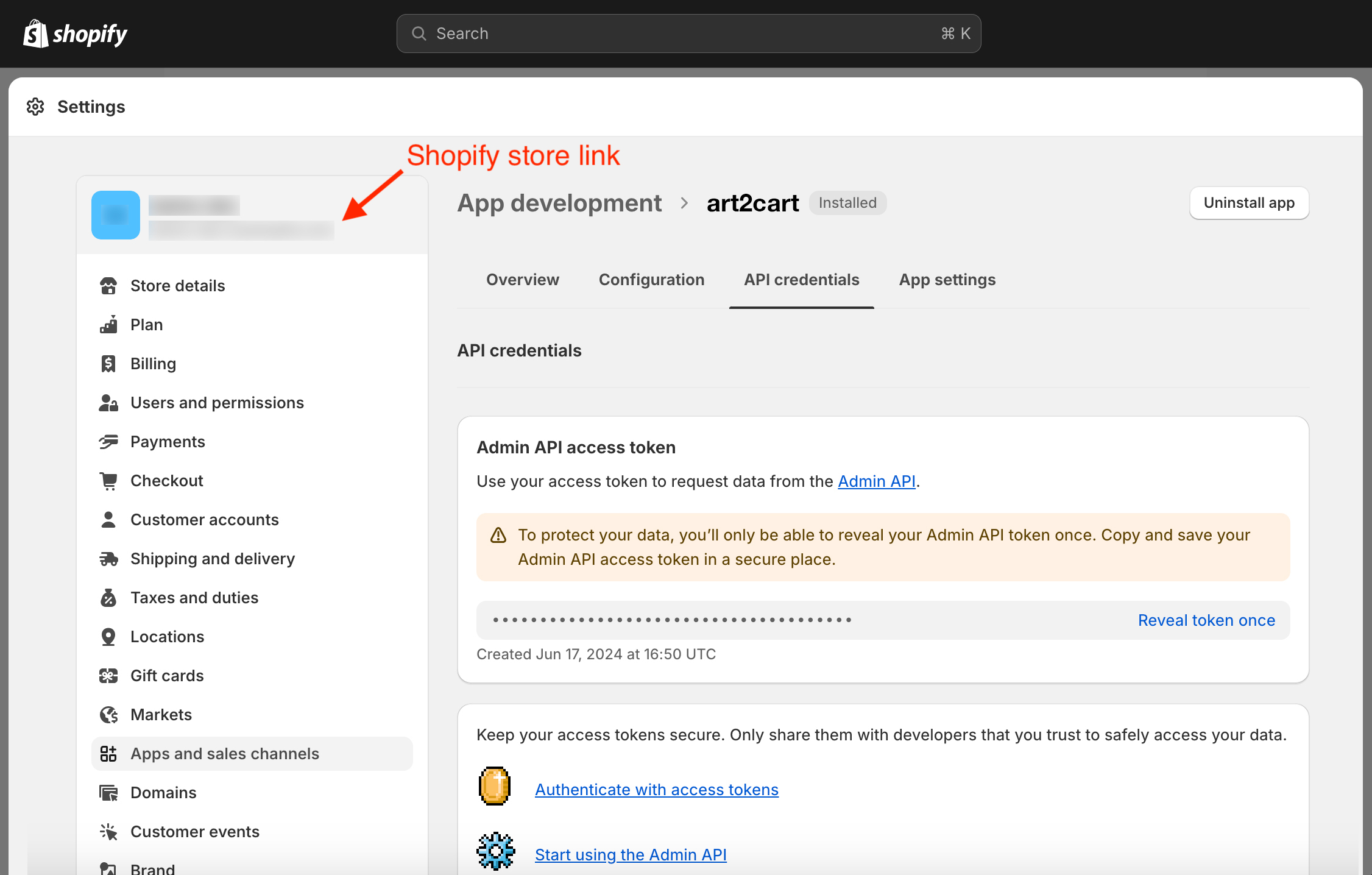 Back on the App Dashboard, click the API Credentials tab. In the Admin API access token section of the API credential tab, click Reveal token once.