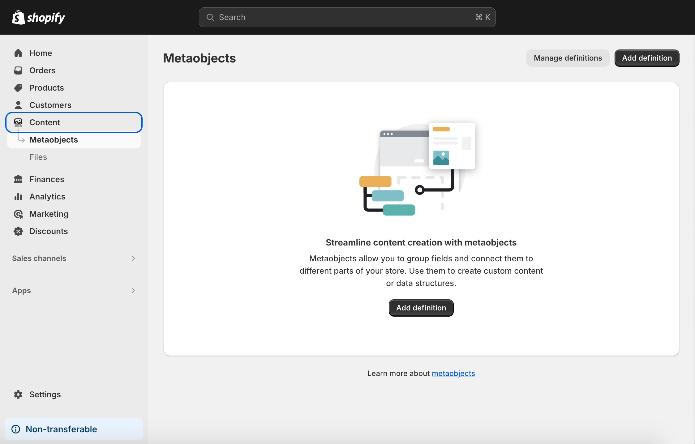 When the Art2Cart job is completed, go tothe the Shopify Store Admin page. From the left menu, select Contents - Metaobjects and click on the Manage Definition button. (Alternatively, click Settings on the left menu in the Admin page and then on the Setting page left menu, click Custom Data.)