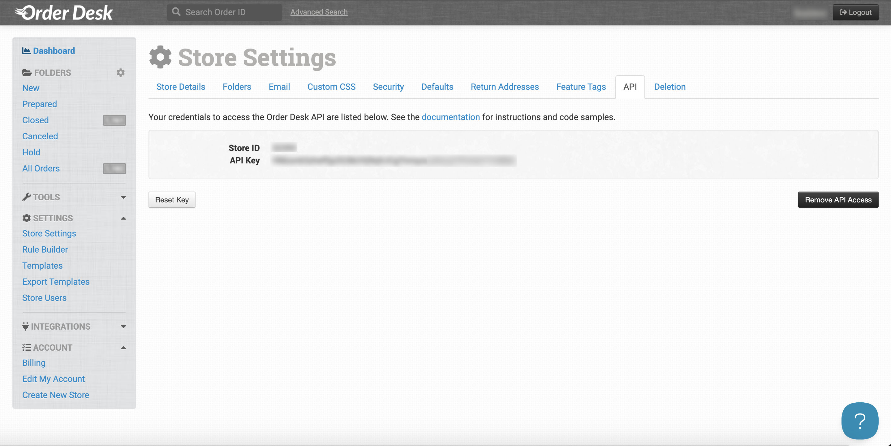 - In the Order Desk dashboard, go to the Store Settings page, click the API tab, and create an API Key, if one is not already created.