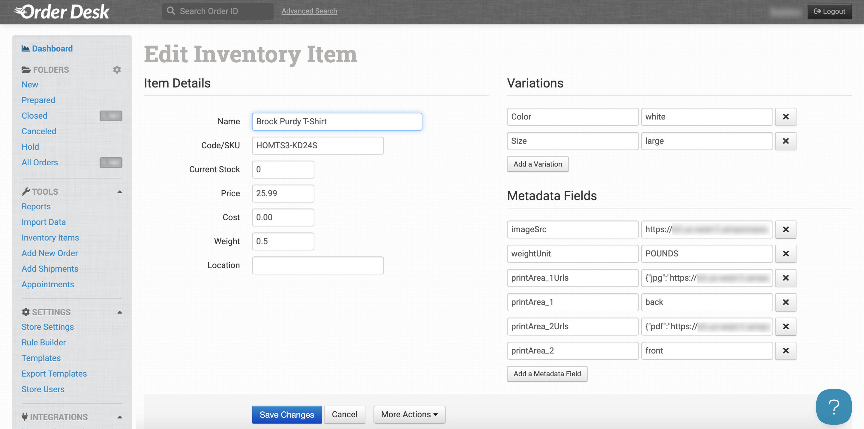 After your product is created in Art2Cart, a new inventory item will be added to Order Desk. By default, product title, SKU, variant information are included along with metafields for imageSrc, weightUnit, printArea*# and printArea*# Urls.