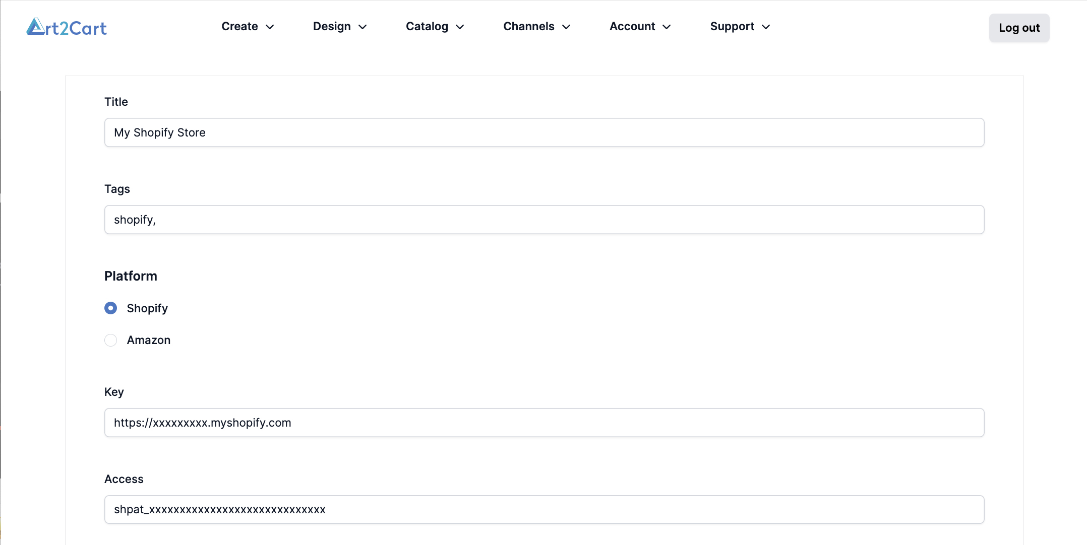 Fill out the Store Name, any Tags and select the Shopify Platform. Then enter your store link into the Key field and the Shopify App token into the Access field. Click Save to allow Art2Cart to publish products and listings directly to your Shopify store.
