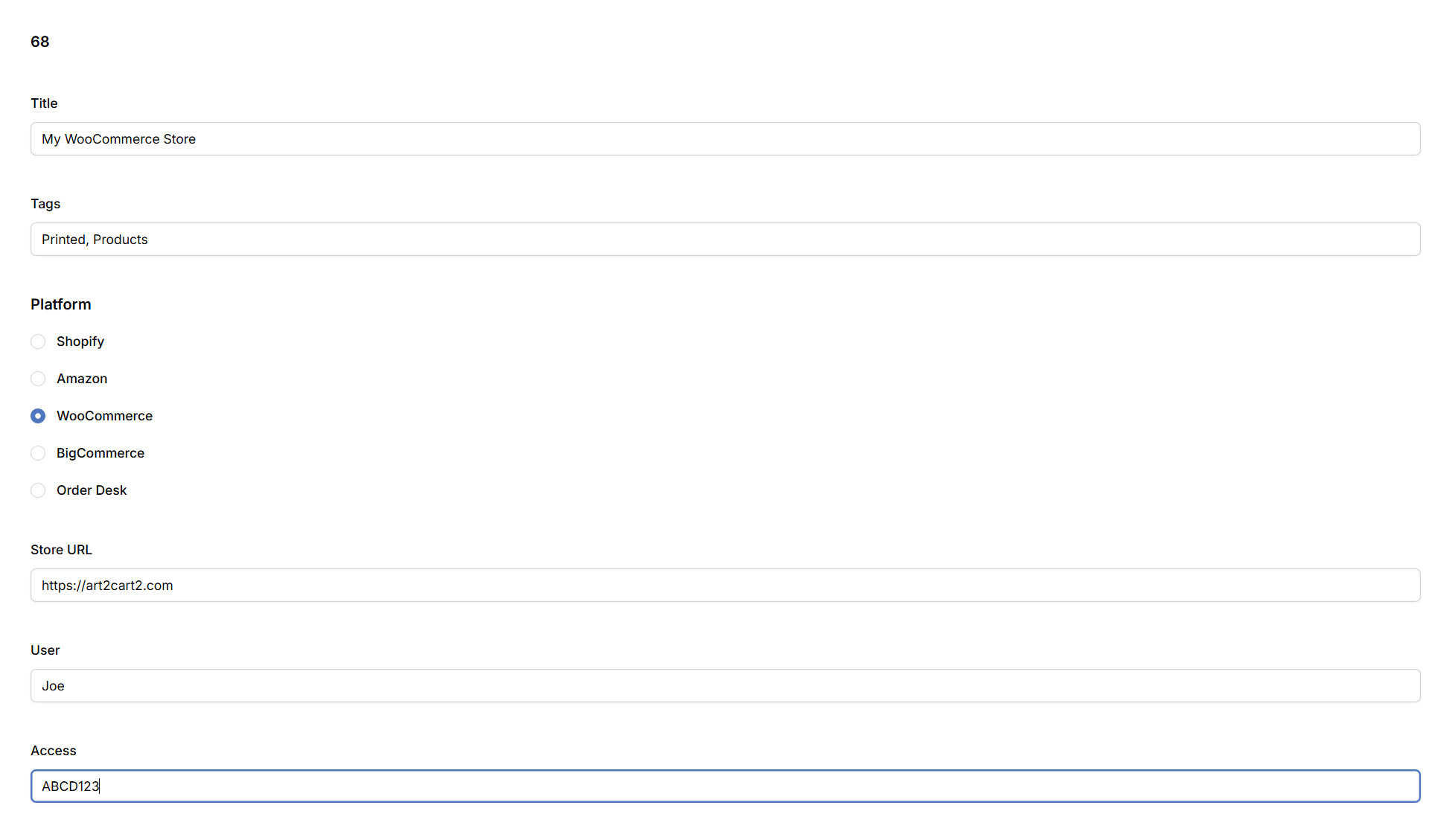 - Fill out the Store Name, any Tags and select the WooCommerce Platform. Then enter your store url, and credentials and the WooCOmmerce App token into the Access field. Click Save to allow Art2Cart to publish products and listings directly to your WooCommerce store.