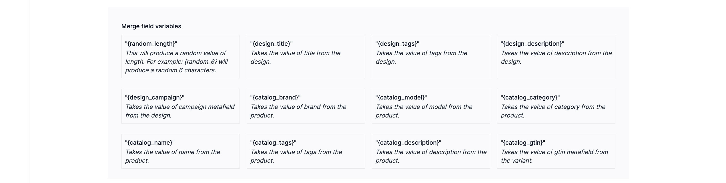 - The listing wizard uses merge field variables that incorporate the information saved with each design or catalog product. For example, the description text that is saved as part of a catalog product can be added to your listing by referring to {catalog_description} instead of re-entering all the data.