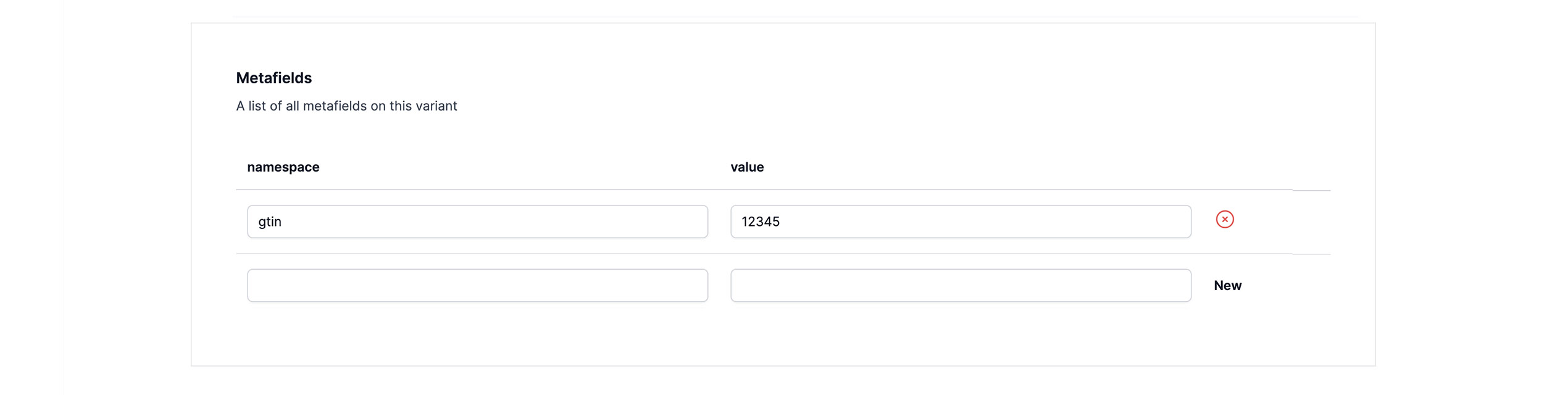 Included with these fields are the customer defined metafields. In the example below, the merge field {catalog_gtin} is created from the catalog product variant metafield namespace gtin.