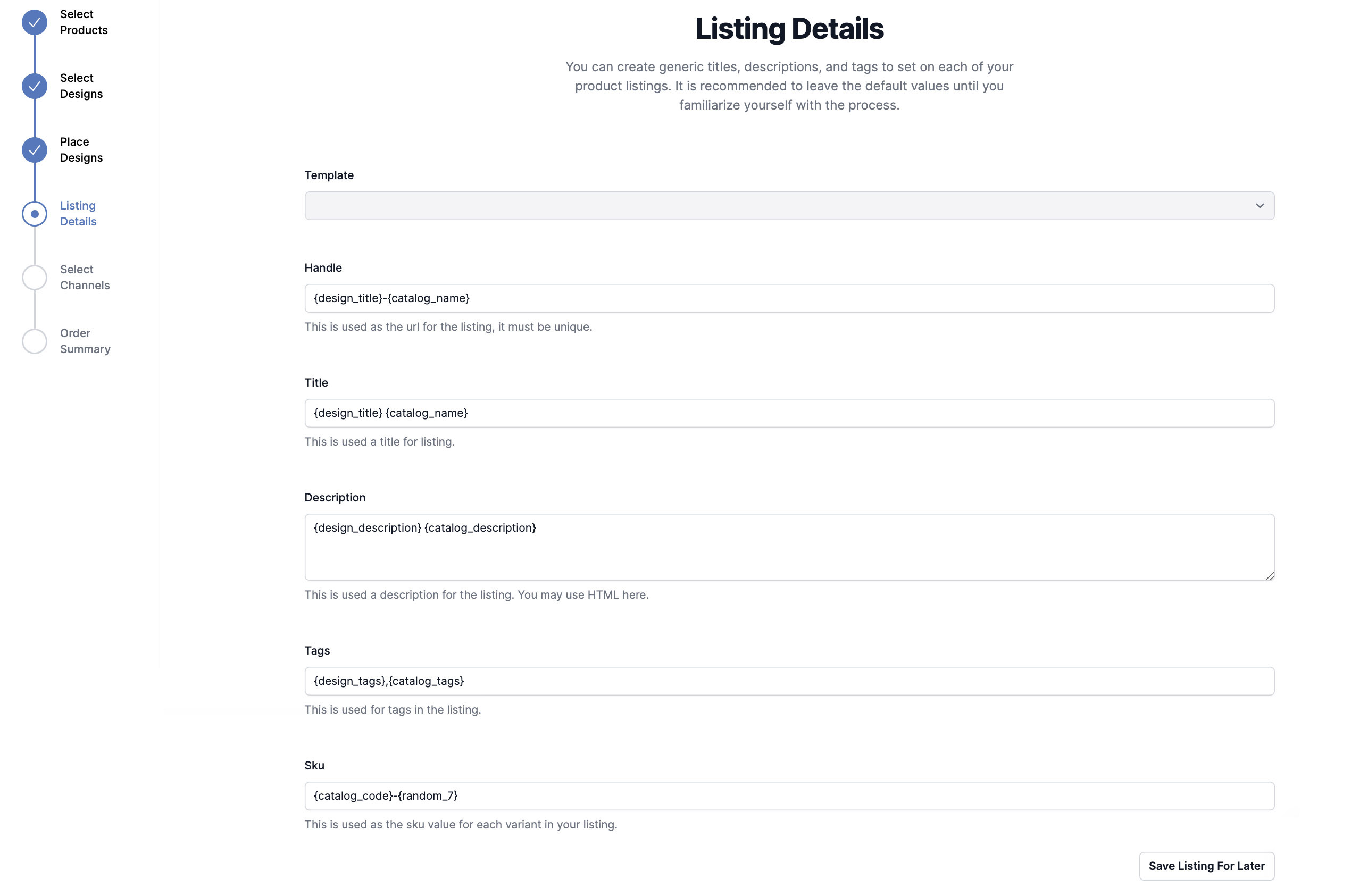 - The fields in the listing wizard are literal so you need to review all the text and mark you enter into the field. For example, {design_title}{catalog_name} is not the same as {design_title} {catalog_name} or {design_title}-{catalog_name}.
