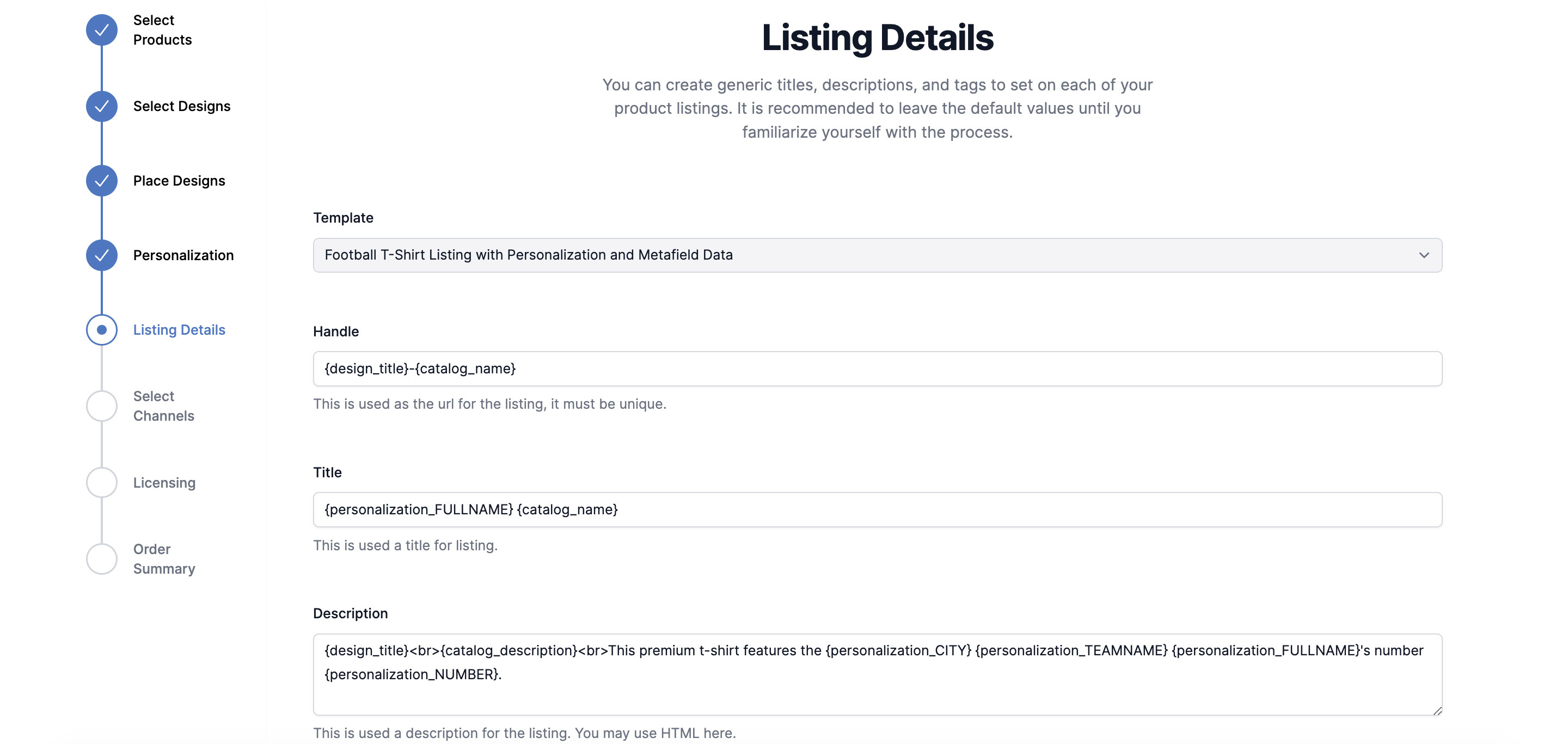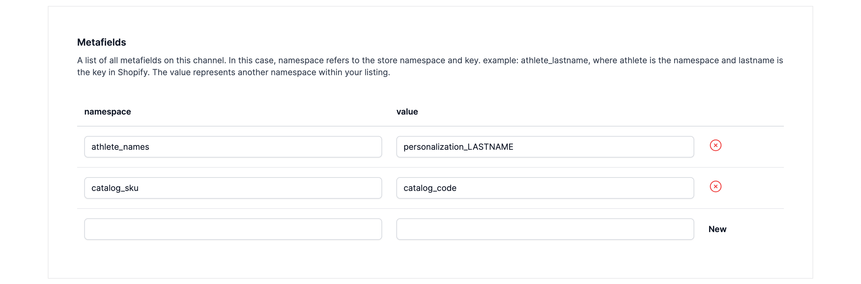 Custom metafields can be created in various methods. The first way is to use the metafields section in the Design page, Catalog Product - Variant page, and Store page. The standard UI to create a Metafield takes a namespace (that is, the name of metafield) and a value (the value of the field). Thereafter, to use the metafield, for example in the listing template, enter {design_namespace} or {variant_namespace}. The store metafields cannot be used for swapping in the listing template.