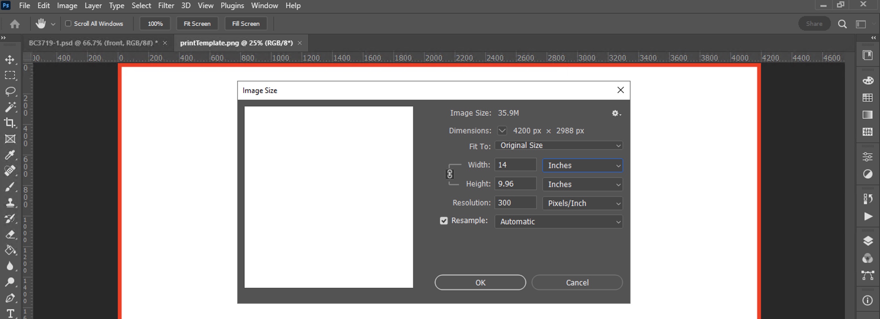 - Confirm that the dimensions and resolution are the same as required. Photoshop automatically scales to 1000px max and 72 PPI if Place Linked is used instead of Place Embedded. This may result incorrect scaling of your placed designs.