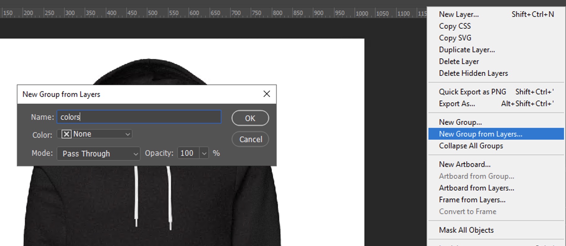 Select all the color image layers in the Layers panel and put these layers into a layerset named "colors" (note: exactly "colors" as it is case-sensitive) by choosing New Group from Layers in the Layers panel menu. If you have only one variant (white), name it "white" and put that into a "colors" layerset.