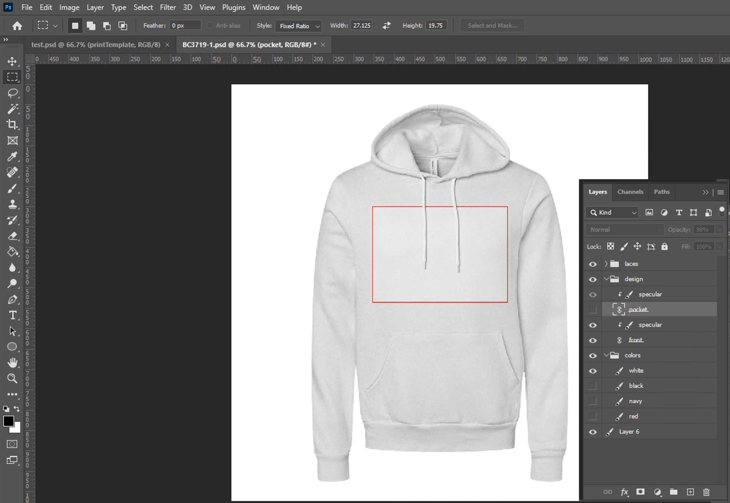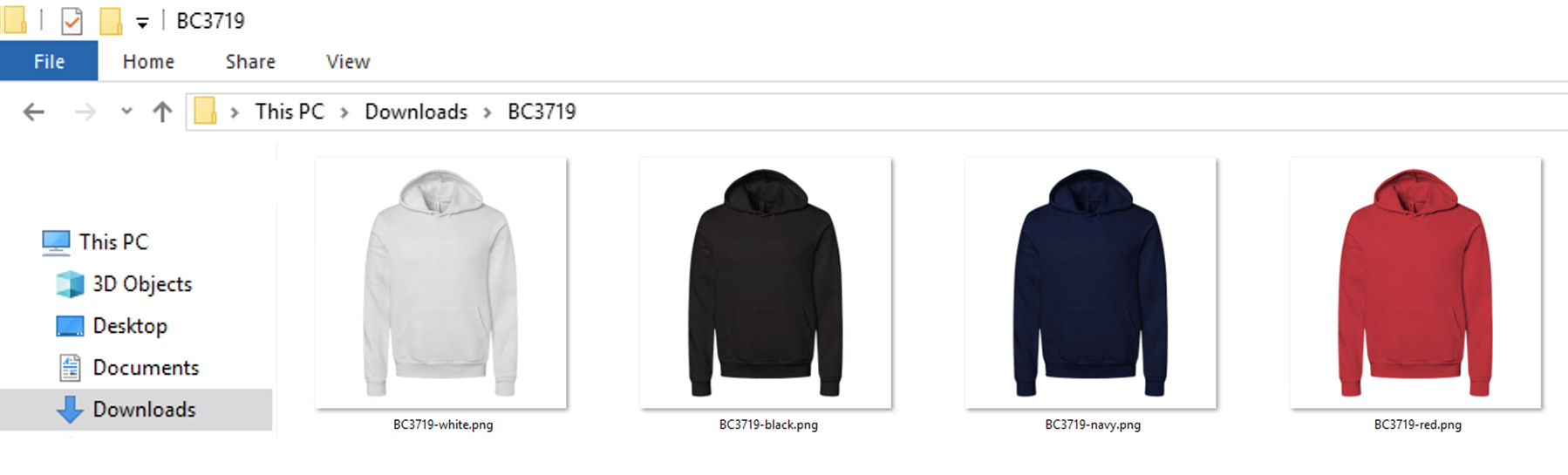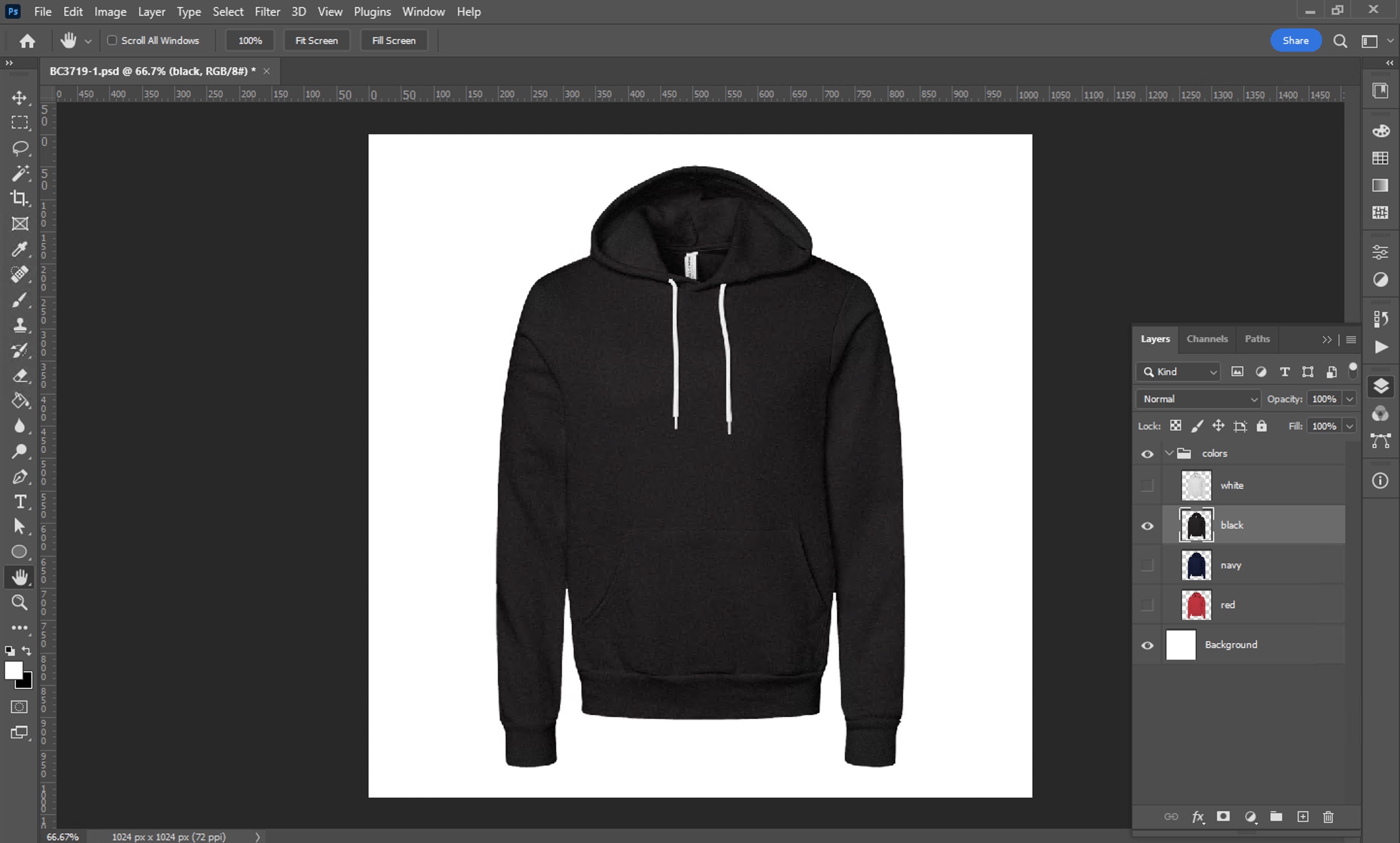 In this example, we turn four color images of a hoodie into a template (white, black, navy, and red). We will assume that you know how to use basic Photoshop functions and how Photoshop mockup files generally work. This is not a detailed tutorial on how to make Photoshop mockup and will skip over some aspects of using those basics skills.